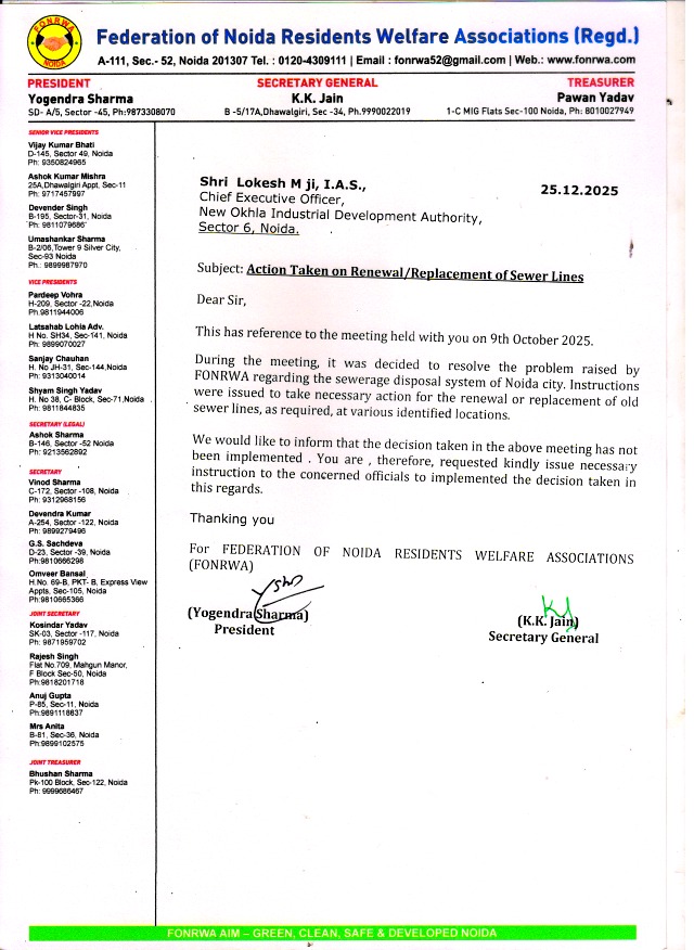 Noida (SBS News हिंदी)। Federation of Noida Residents Welfare Association (फोनरवा) ने माननीय मुख्य कार्यकारी अधिकारी, Noida Authority को पत्र लिखकर शहर में पेयजल की शुद्धता सुनिश्चित करने और पुरानी सीवर लाइनों के त्वरित व स्थायी सुधार की मांग की है।